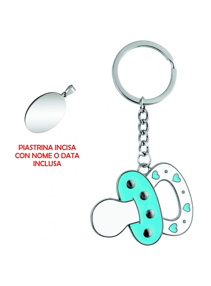 Portachiavi Ciuccio Azzurro in metallo cromato, 50x90 mm con piastrina cromata 20x29 mm incisa